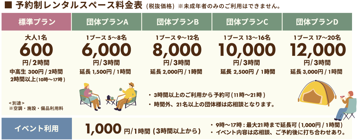 人数が多いほどお得になるのが、グループ利用の魅力です。標準プランでは1人600円で2時間のところ、団体プランになると同じ金額で3時間ほど使えるため、かなりコスパが高くなります。たとえば20人で3時間利用しても、1人600円のまま。飲食店を貸切るより、Kasahara Laboがお得で自由に楽しめます。