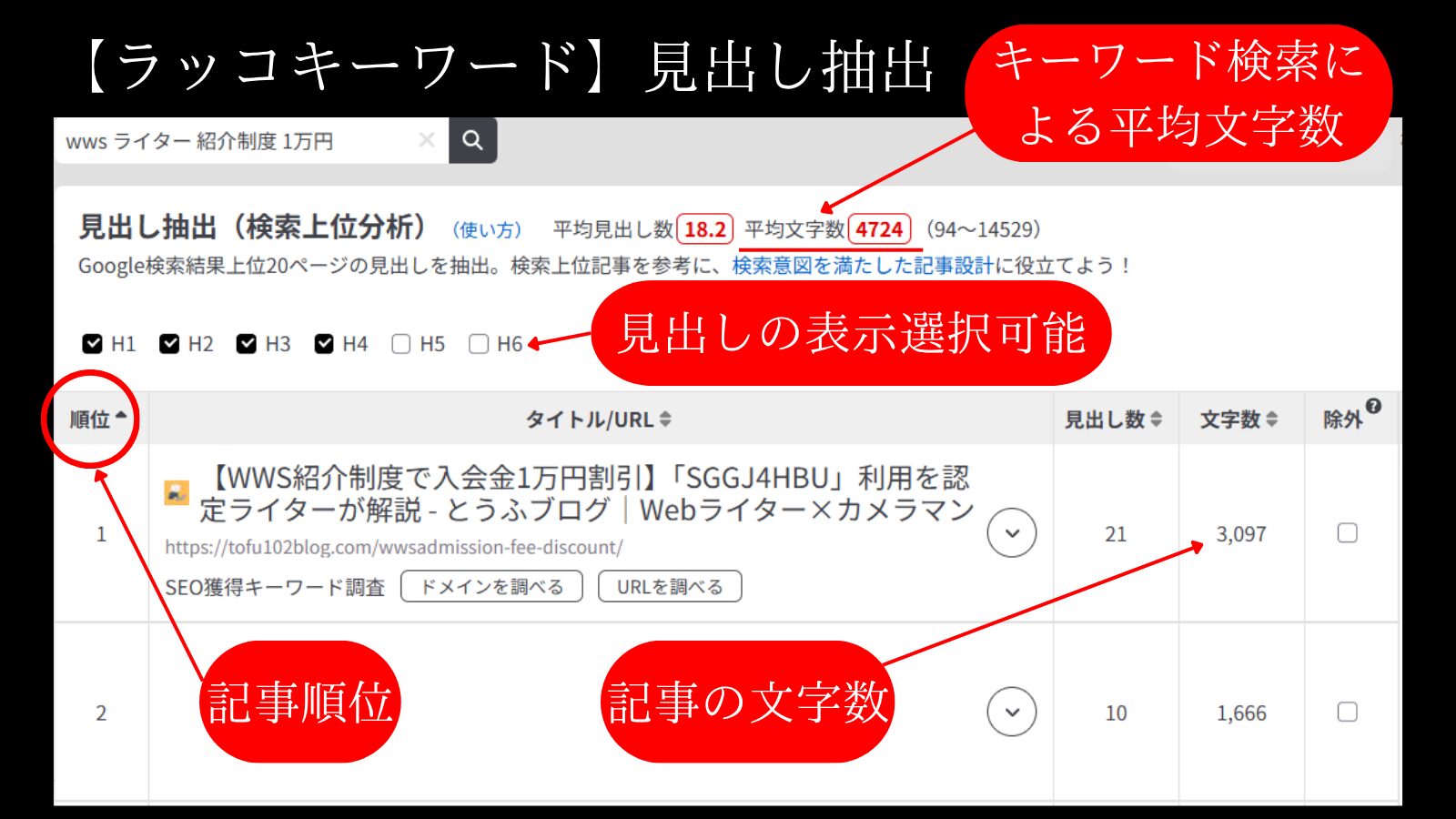ラッコキーワードを使うと競合調査を効率化できます。ラッコキーワードは、競合分析に必要な機能がすべて揃っているからです。WWS受講生にとって非常に心強いツール。「見出し抽出機能」では「上位20記事の見出し・文字数・順位」を一覧で確認でき、競合調査とキーワード選定を一度に完了できます。